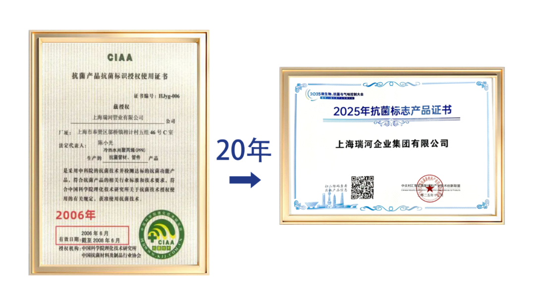 2004年,集团公司成功研发PP-R管材(Ag+银系抗菌型);2006年,加入中国CIAA组织,并接轨国际前沿抗菌技术;自2006年起,集团公司已连续20年荣获CIAA认证,携PP-R抗菌管等众多创新产品,成为了管道行业的品牌标杆。