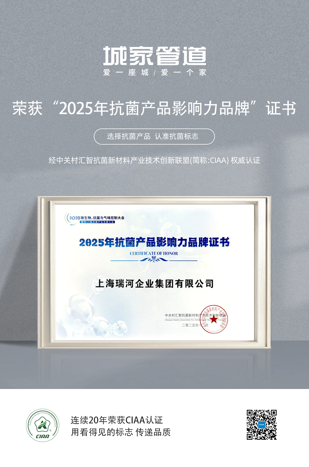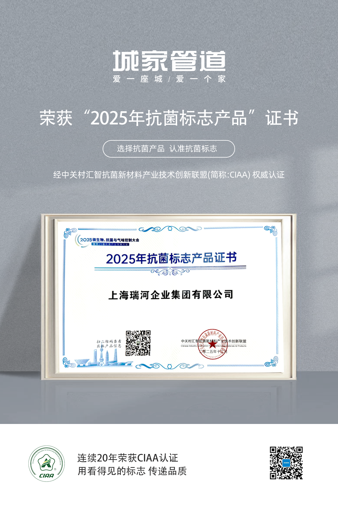 城家PP-R抗菌管 蝉联“2025年抗菌标志产品”奖项,CIAA(抗菌产业技术创新联盟)发布的抗菌标志代表行业最高技术要求。公司凭借在抗菌管道领域的突出表现,成功通过CIAA的严格审核,城家PP-R抗菌管成为CIAA发布的“2025年度抗菌标志产品”。